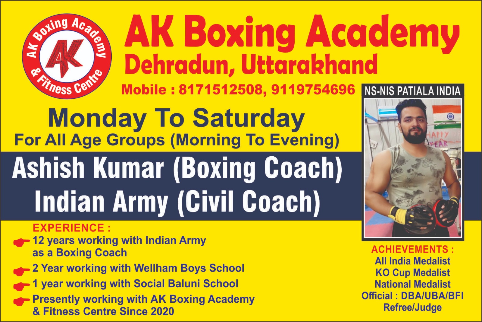 Our team is led by Ashish Kumar a national medalist and all India medalist as a Boxer, Judge with Dehradun Boxing Association (DBA) & Uttarakhand Boxing Association (UBA) working with Indian Army as Civil Coach for 10 Years. With his expertise, he has trained numerous athletes who have gone on to complete and win at the highest levels in State & National Medals and in many schools worked as a boxing Coach. The experience in boxing career over 23 Years. Currently Running AK Boxing Academy and fitness center over 2 Years and achieve many medals in state and national level.